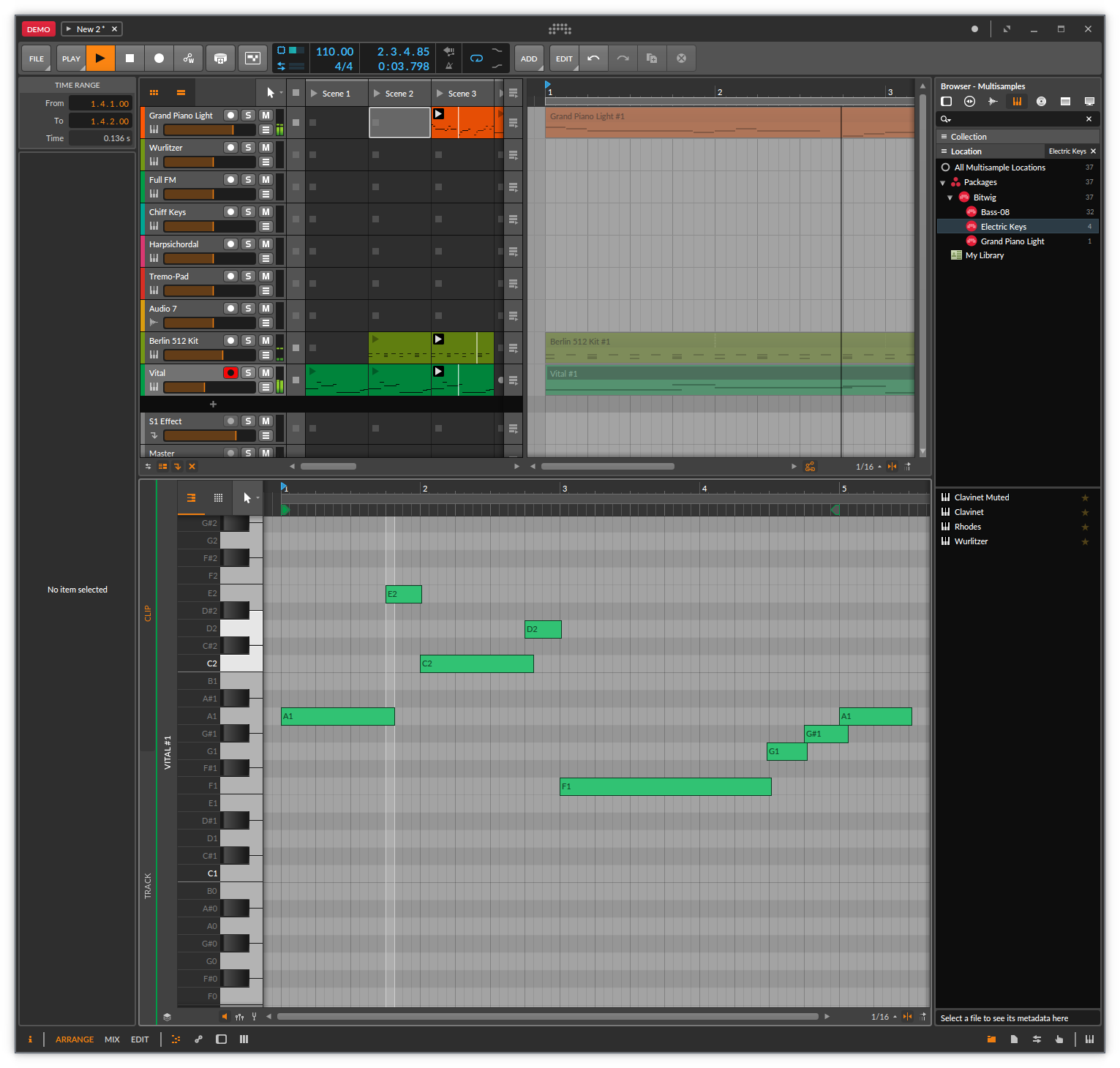 So, the resulting track of this post was a mixture of a fuzzy bass preset of Vital, Bitwig’s Grand Piano and some built-in drums.