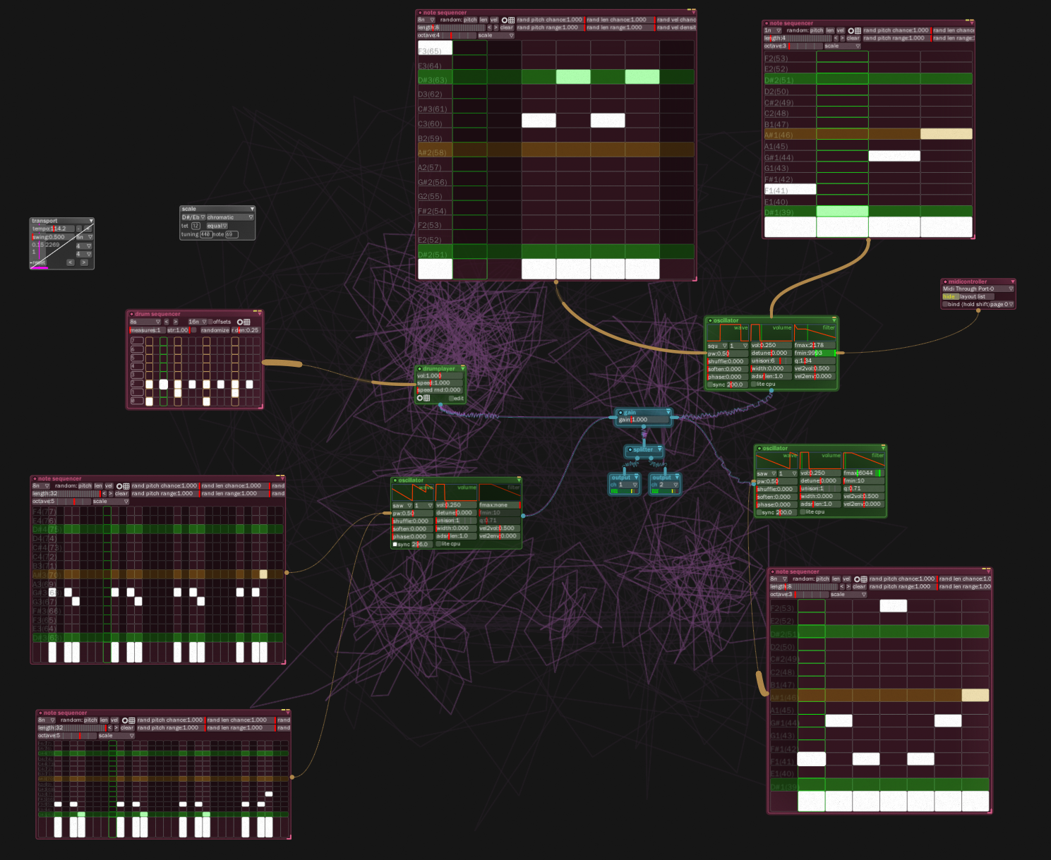 Today I took a short look at Bespoke Synth, a free OpenSource synthesizer. It is a module-based synth and lets you connect them to each other to generate… music! I’ve seen some people do really cool things with this thing, especially in the directon of generative sound design. I, on the other hand, didn’t leave my comfort zone that far. I started out by putting the thing into “chromatic” mode, popped up some note sequencers and started writing down notes. It was still a lot of fun and Bespoke’s looping capabilities are really nice. This is how the thing looked in the end: